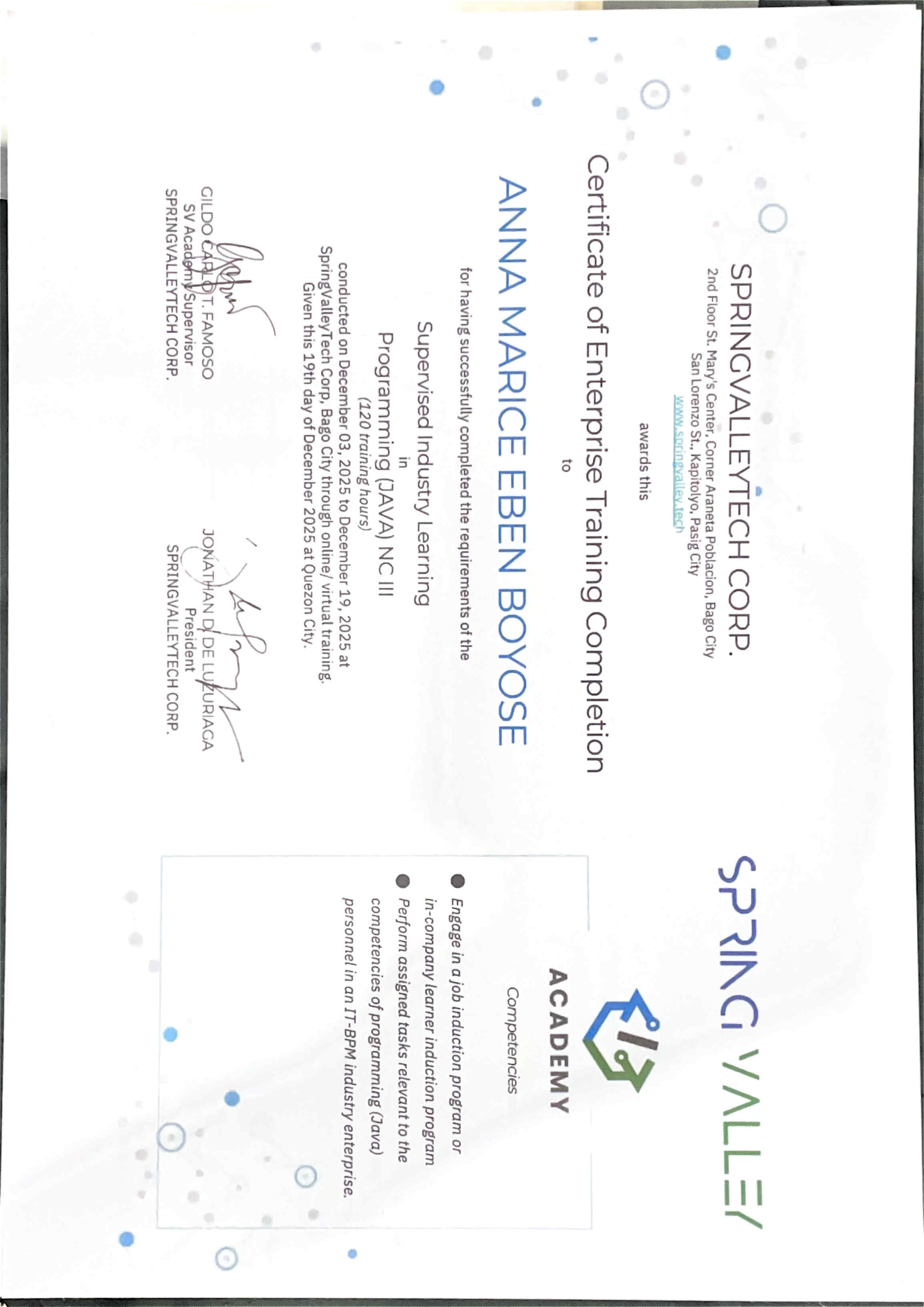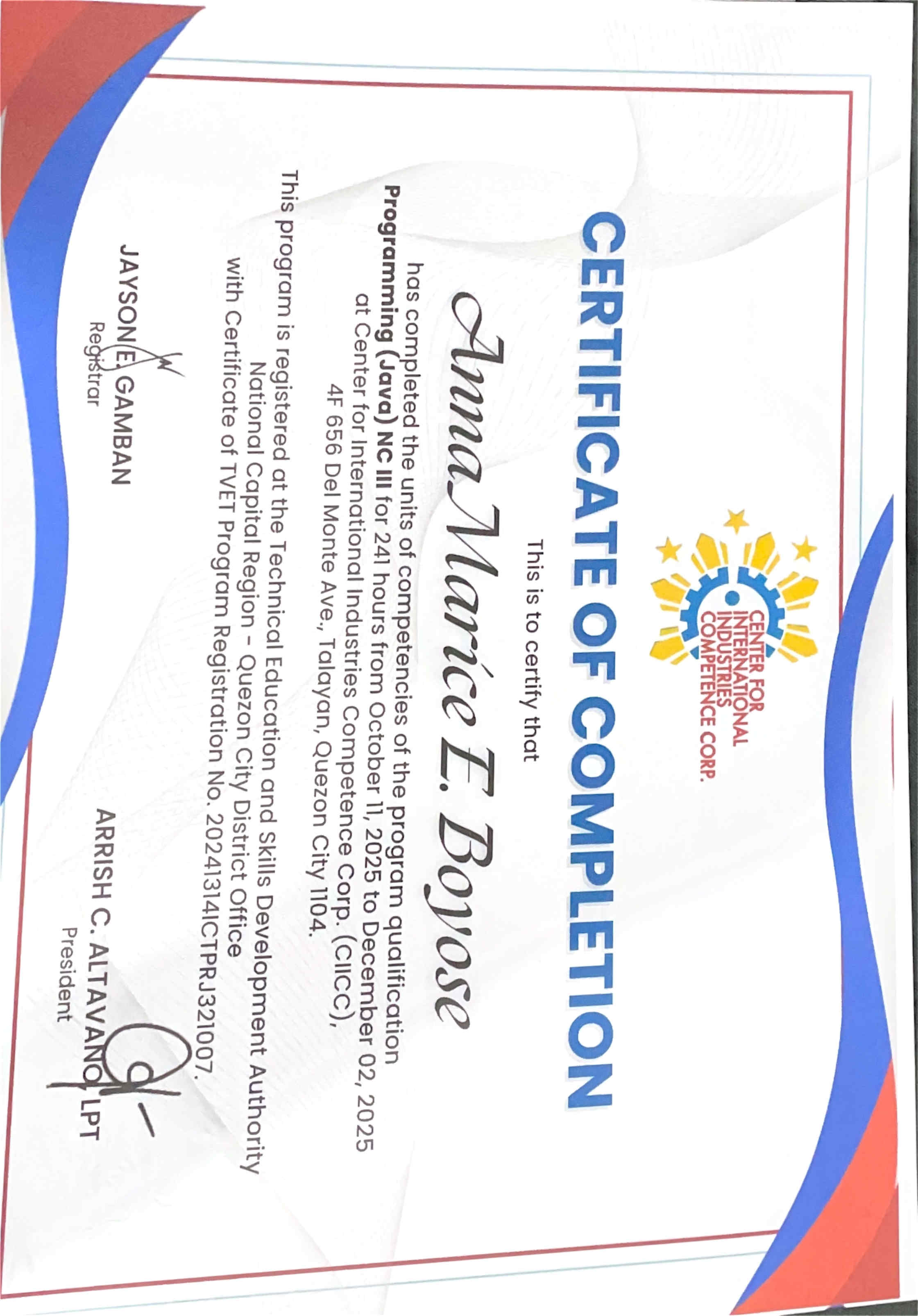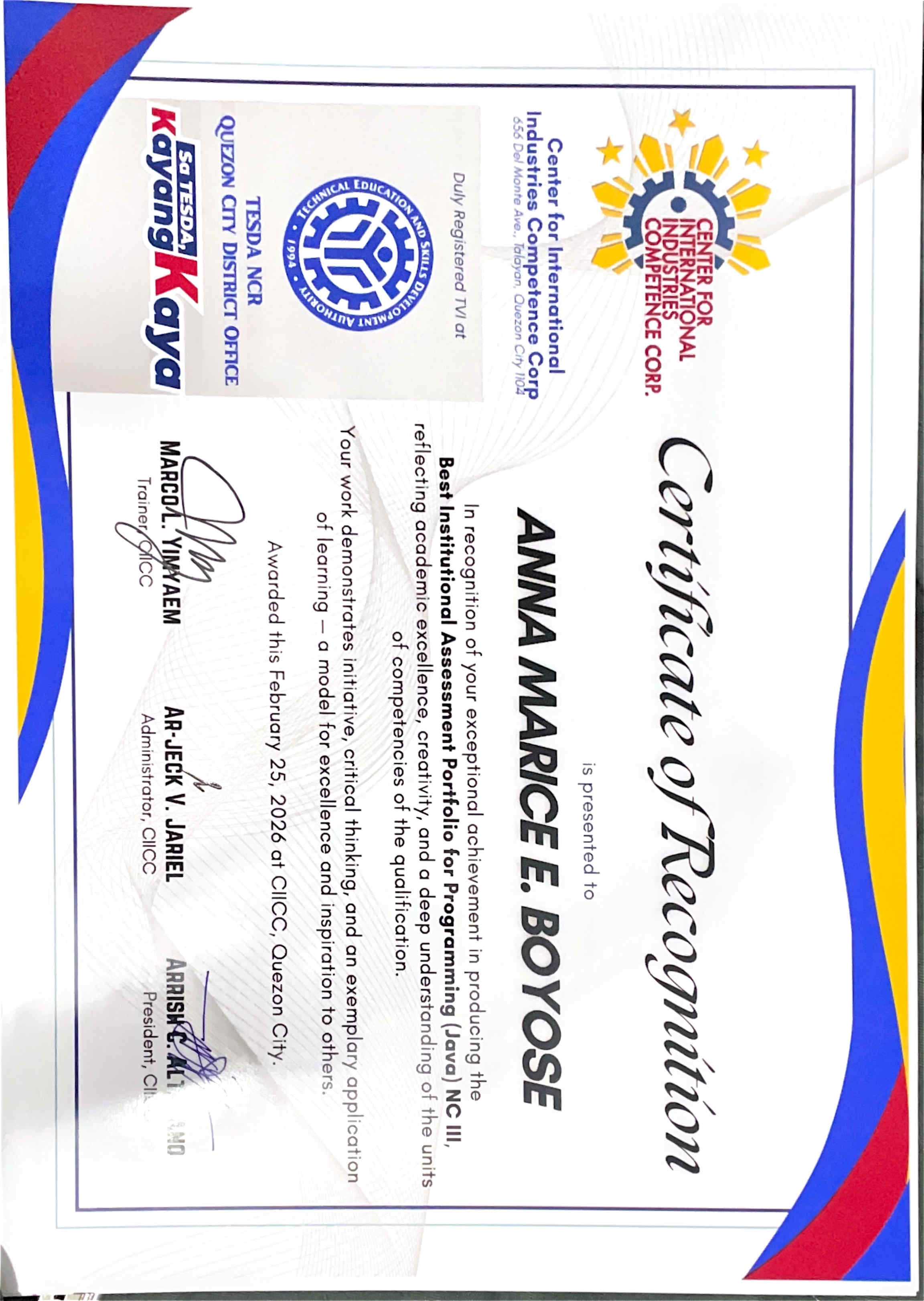 for Programming (Java) NC III, demonstrating strong technical skills, creativity, and critical