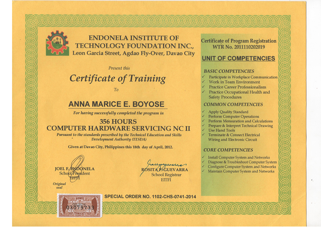 Completed 356-hour TESDA-accredited Computer Hardware Servicing NC II training,
