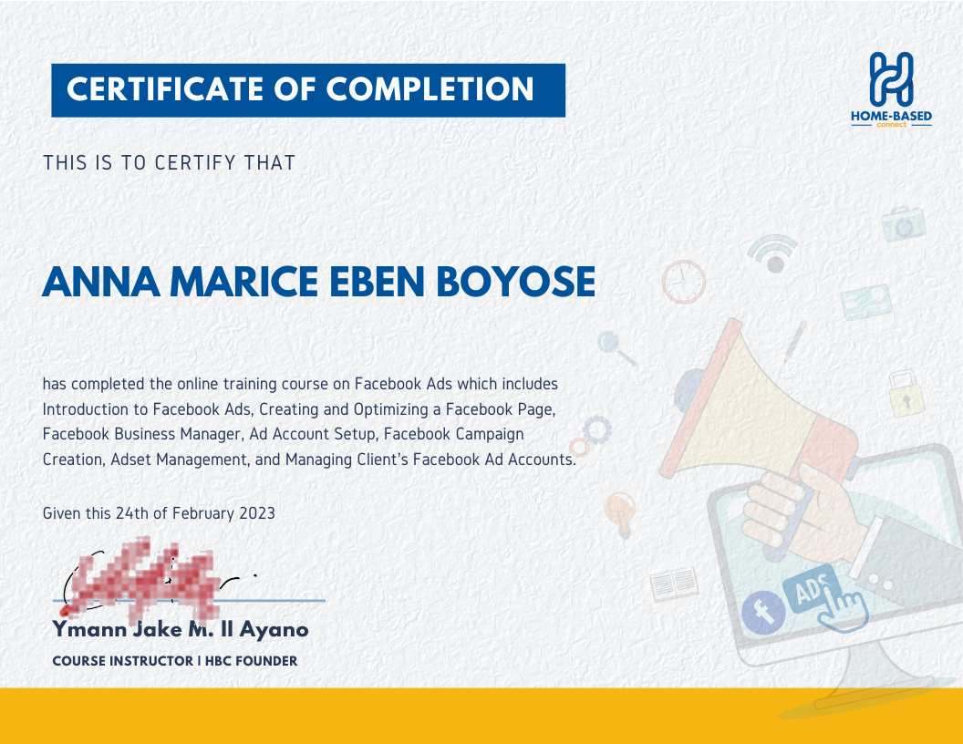 Completed training on Facebook Ads, including campaign setup, adset management, targeting,