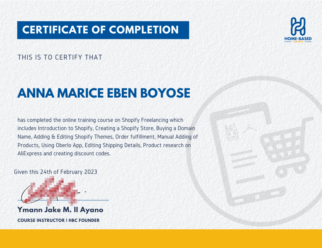 Trained in Shopify store setup, theme editing, product listing, order fulfillment,