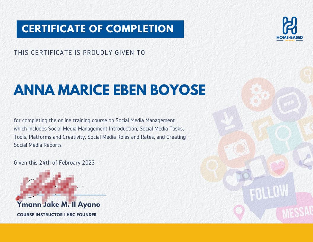 Trained in social media management, tools, content planning, role definitions, and reporting