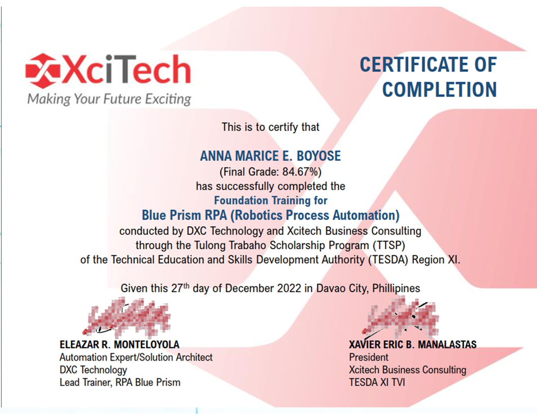 Completed foundation training in Blue Prism Robotics Process Automation under a TESDA
